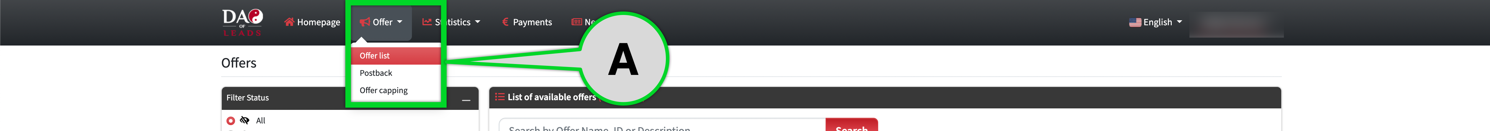 Point B - Filter Status. (By default you don't have access to any offer. At first, you need to request access to the offers that you would like to promote, after approving these offers will become available for you. )