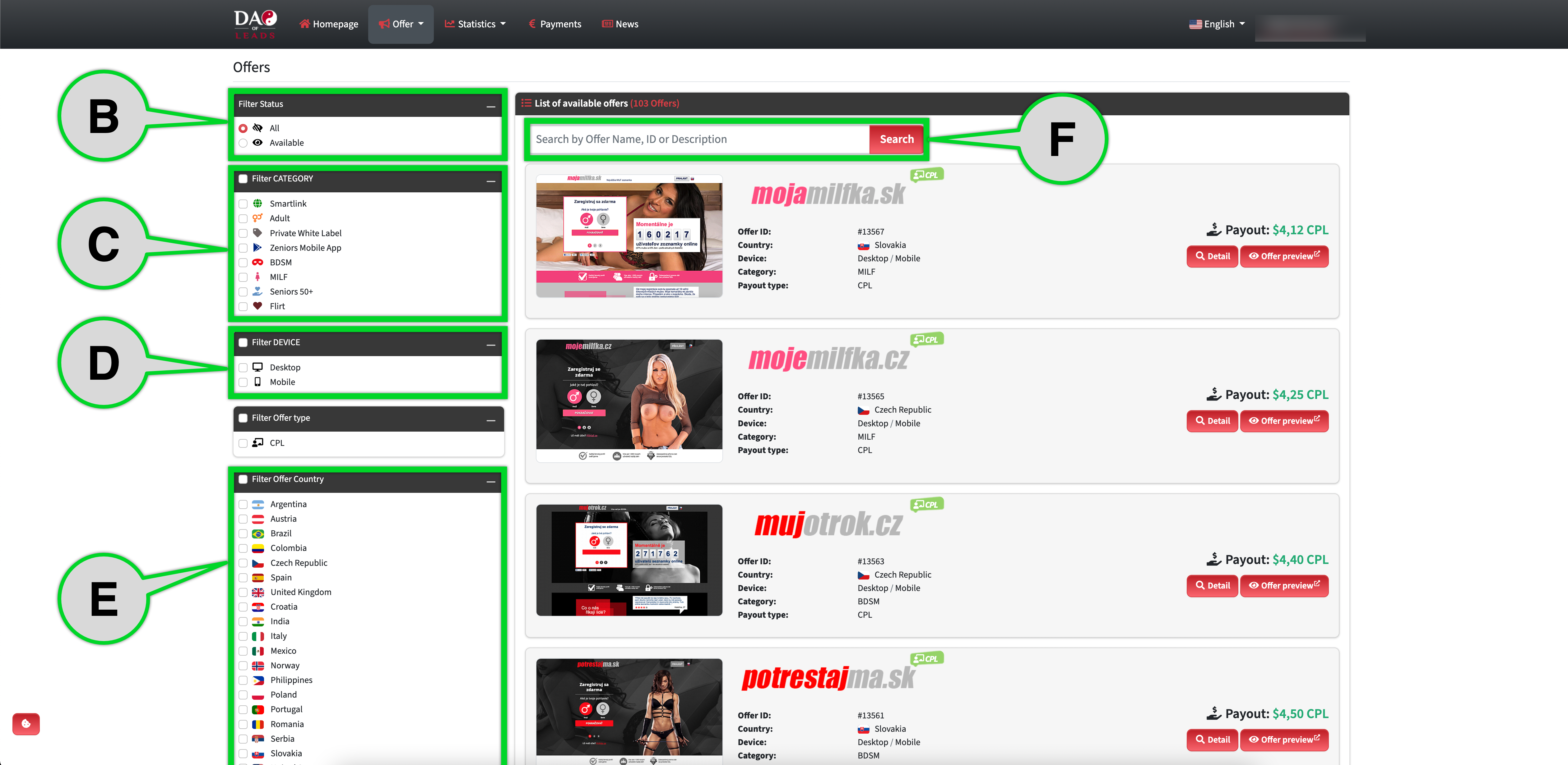 In Offers, you can use the following filters: You can choose a country you want, and you can also select Device and Category. You have an option to search for one or more specific offers.