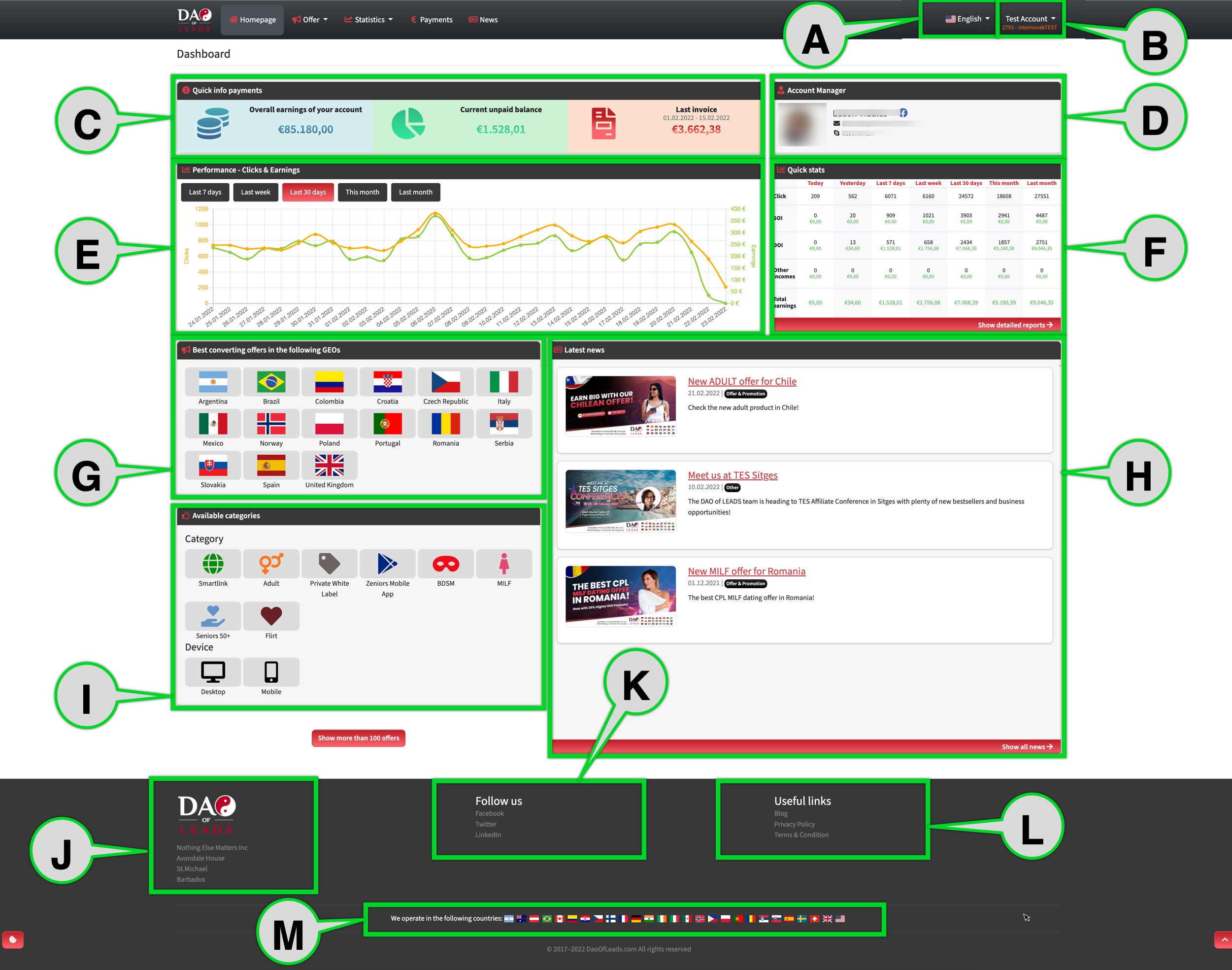 Point F - Quick statistics where you can see brief info of your clicks or payments.