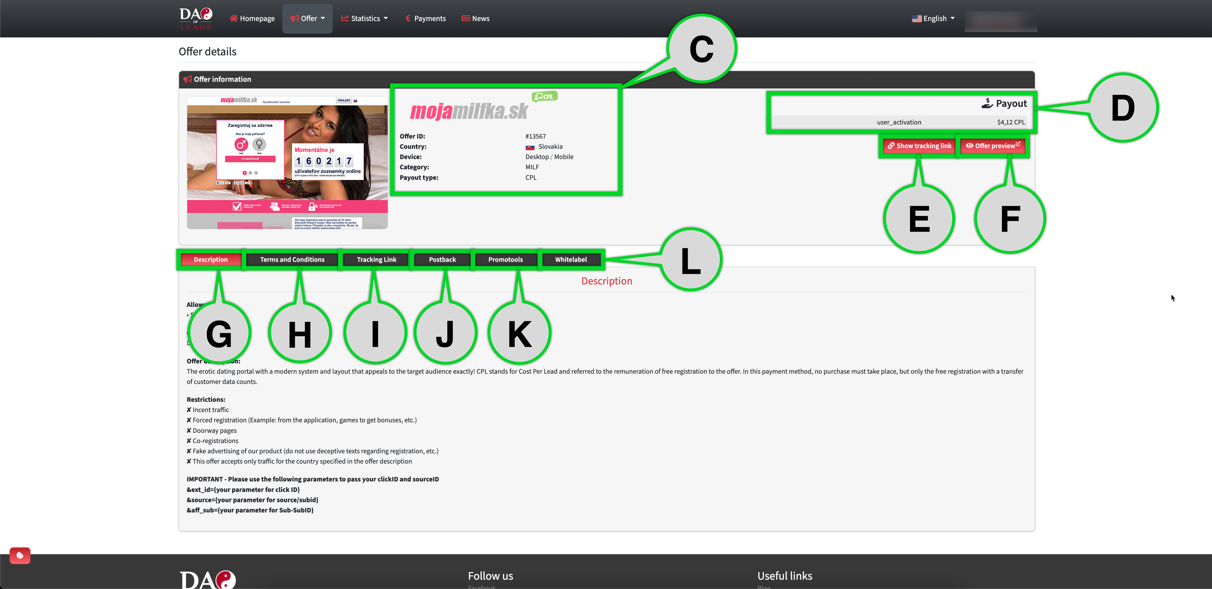 In the offer details, you can see all important information about the offer and you can perform operations like generating links to propagate the offer, adding the personal variables for monitoring your campaigns, selecting a suitable banner, or adding the personal counter to the Event.