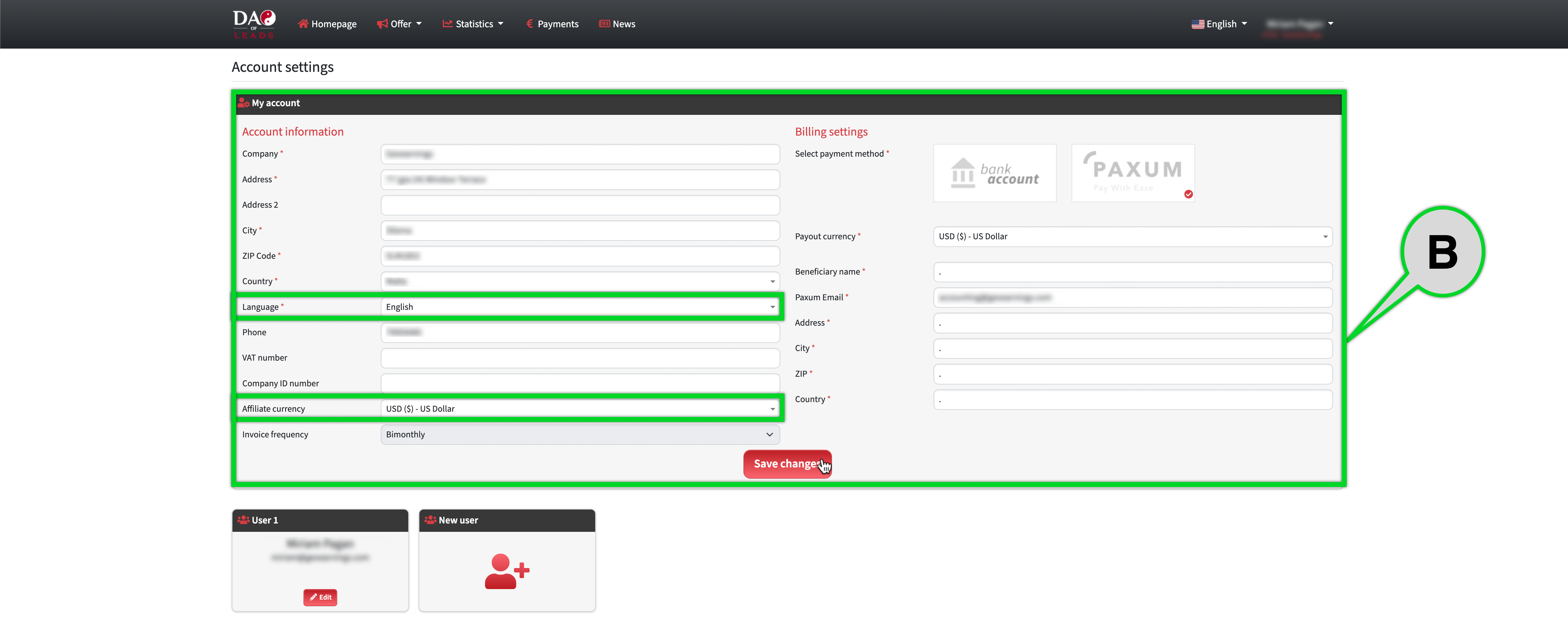 Point B - Change the Language or Affiliate Currency and click on the "Save Changes" button.